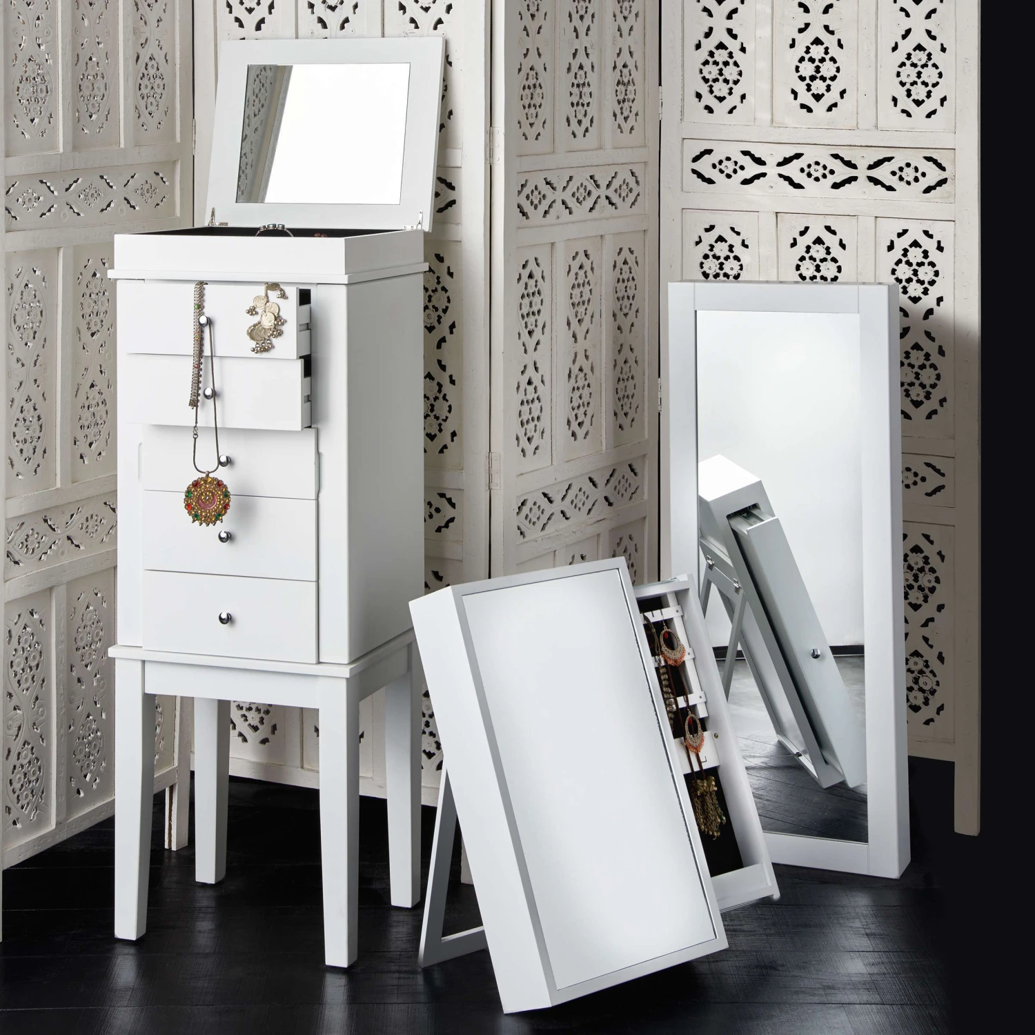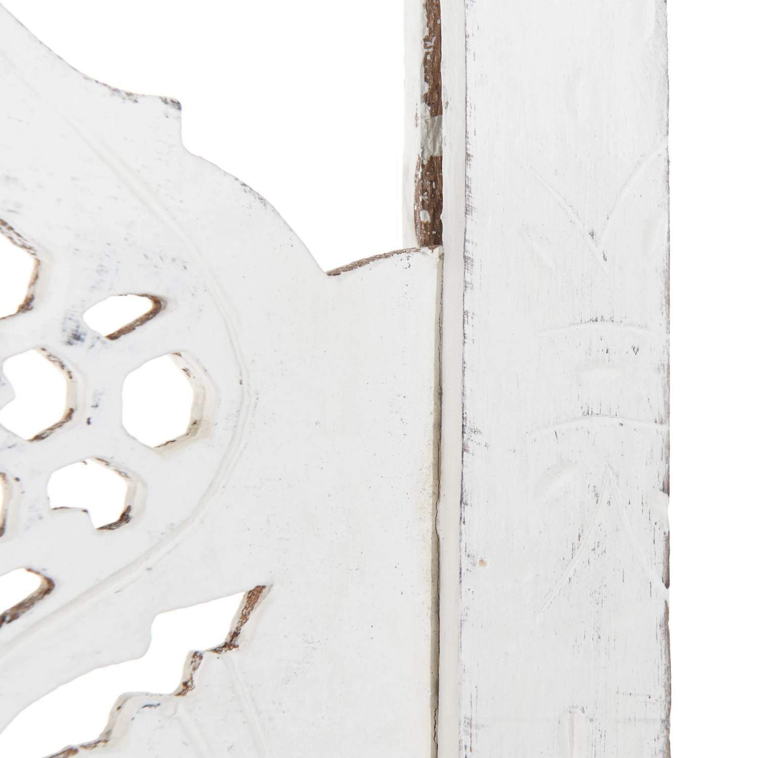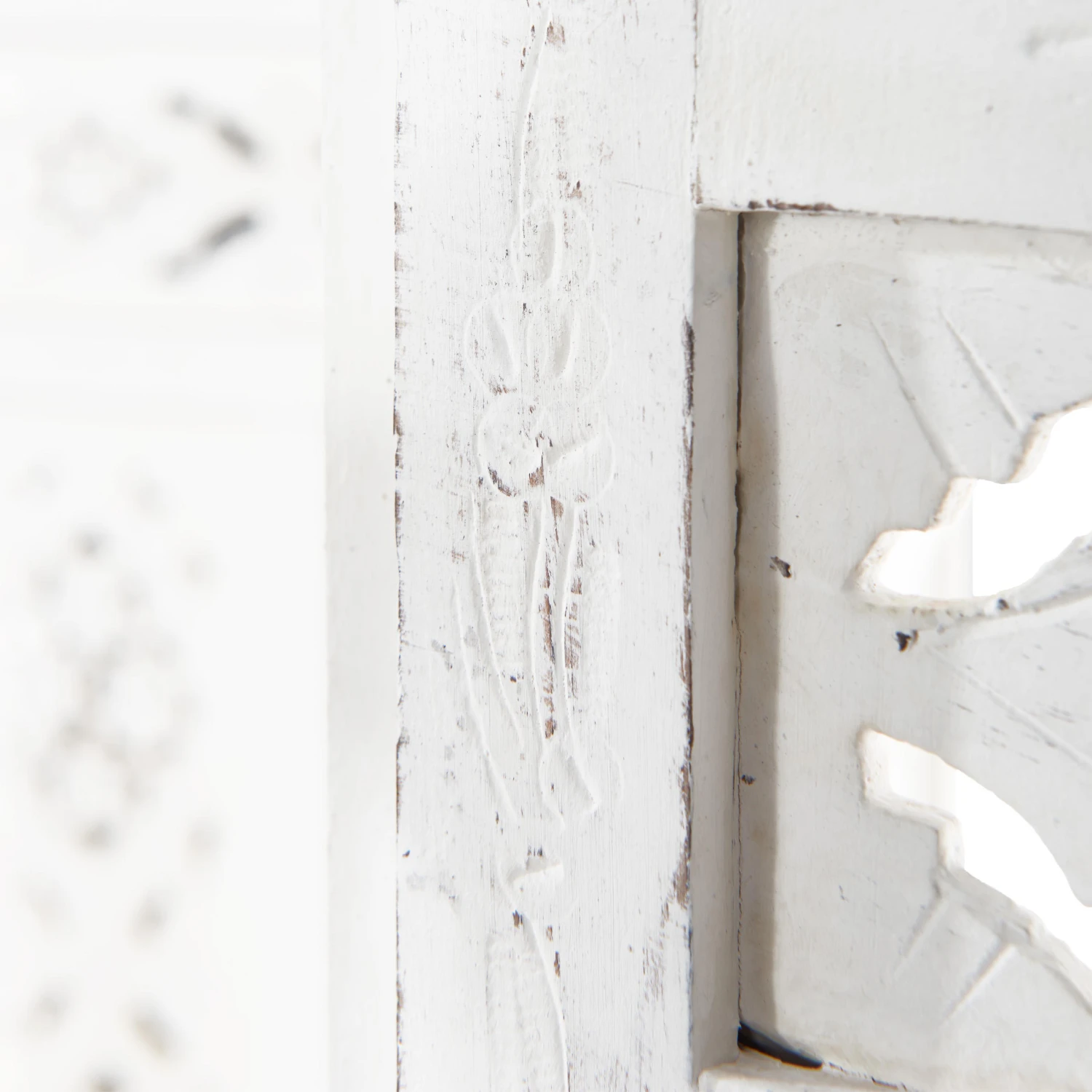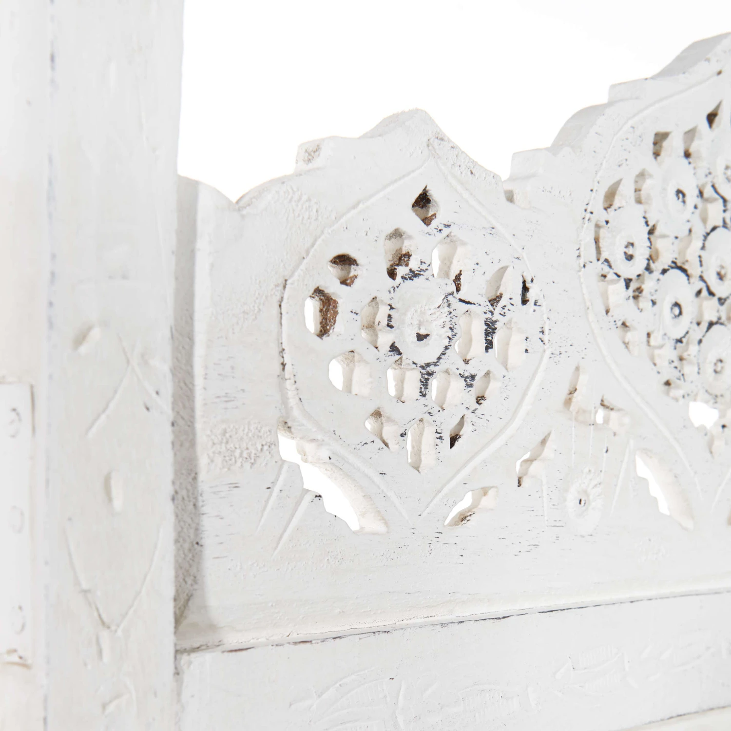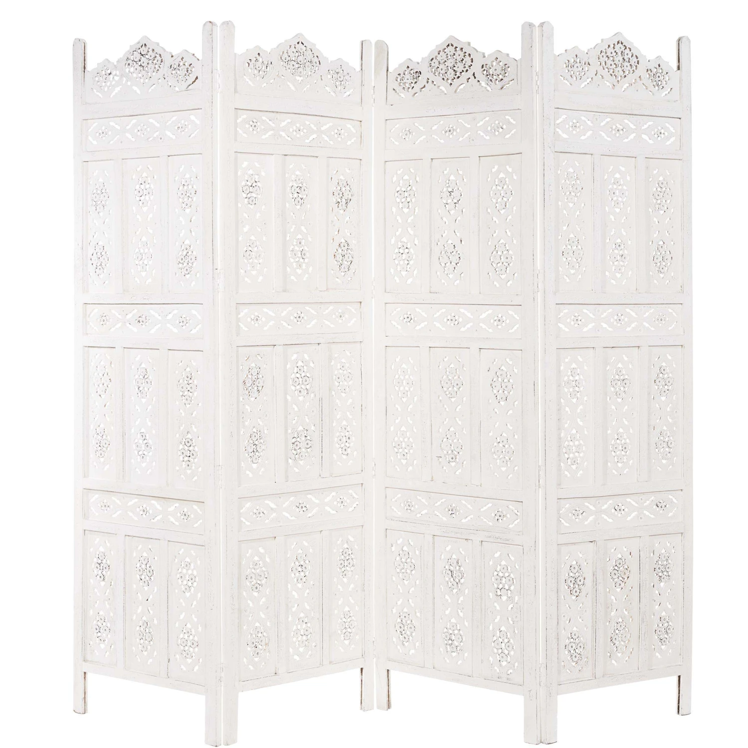 Als stamme er aus einer spanischen Finca, einer italienischen Villa oder einer portugiesischen Posada: Unser weißer Estella-Paravent mit femininen Ornamenten versehen, präsentiert sich charmant nostalgisch und aufwändig gearbeitet. Mit Liebe für das Detail. Denn er wurde von Hand gefertigt und bemalt. Ob als Raumteiler, als Sichtschutz oder Dekoelement: Der Paravent im Vintage-Look ist vielseitig nutzbar und weist deutliche Gebrauchsspuren auf.